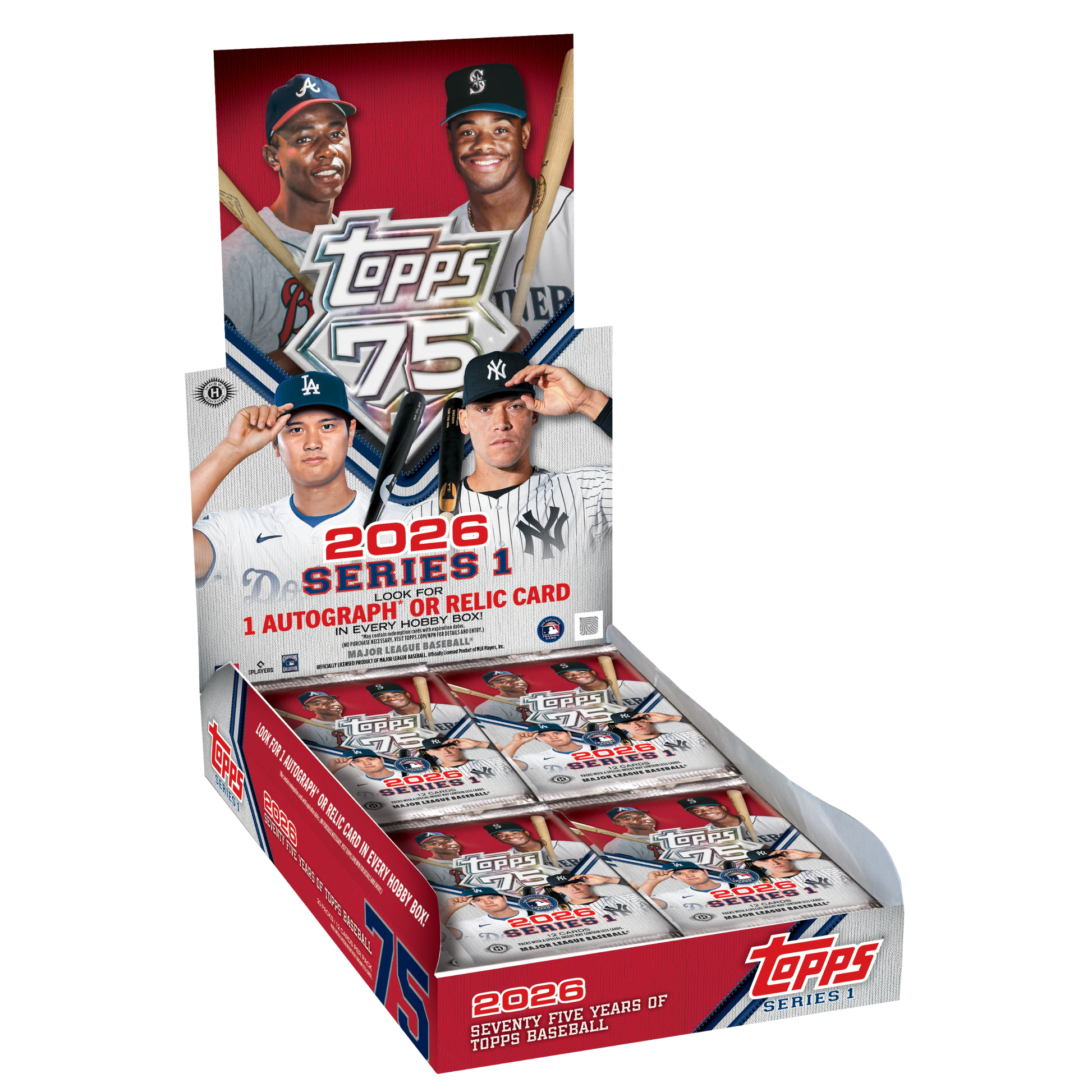 2026 Topps Baseball Series 1 kicks off a year-long celebration of the 75th Anniversary of Topps Baseball, honoring the most iconic name in trading cards. For 75 years, Topps Baseball has defined the Hobby by capturing the game’s greatest players and moments, generation after generation.